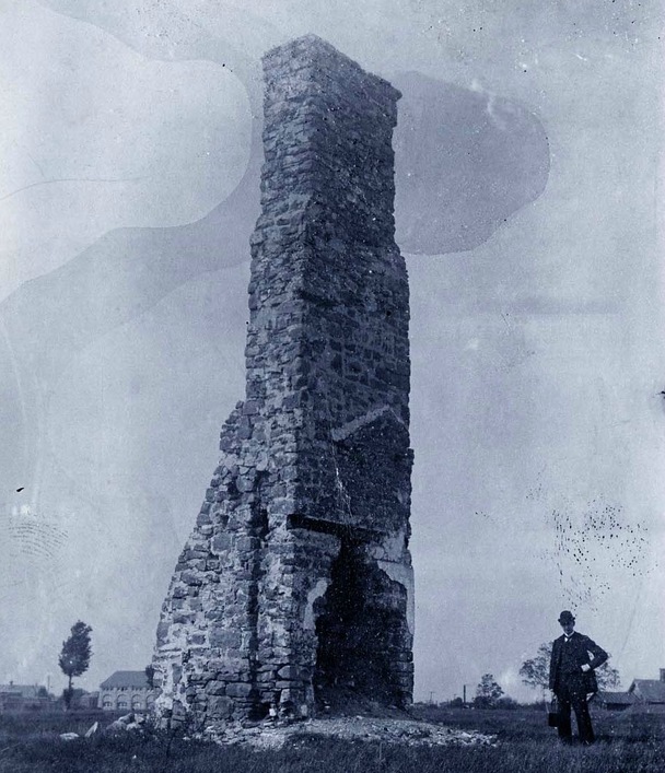 The chimney has been moved several times in its history, as part of efforts to protect this important link to Niagara’s early European history. Here a scaffold has been erected around it to allow workers to carefully number and disassemble the chimney for removal to the new Porter Park. The photo clearly shows the encroachment of the Carborundum Company in the 20th century.