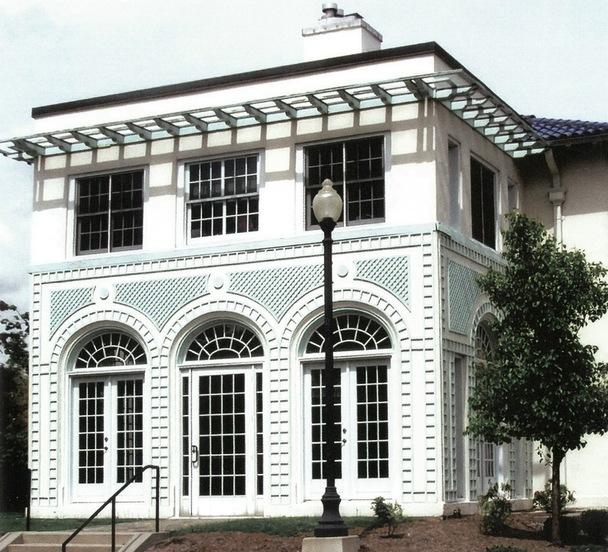 Originally built on the property of a wealthy family’s estate, Rosary Hall is known for its distinguished arched elliptical window design gracing the exterior of the building. In 1912, Herbert Crouch built a 15-room, two-story Georgian mansion that was completely hidden from Main Street. It had an adjoining garage on the “Hill” plus extensive landscaping, including an orchard and vineyard. Containing 7,366 square feet, the 24-foot tall blue-and-white mansion has a blue roof that has been restored in a style duplicating the original roof of blue-glazed tiles.