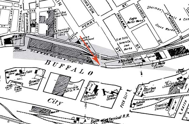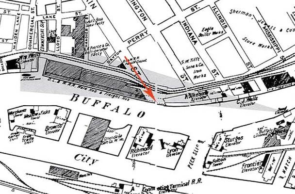 Shaded area of this historic map represents the area in view of the photo above. Red arrow is Main Street where it ends at the Buffalo Harbor. Map courtesy of the "Waterview Guide to Buffalo Harbor," by Kenneth Glaser, Jack Messmer and Paul Redding.