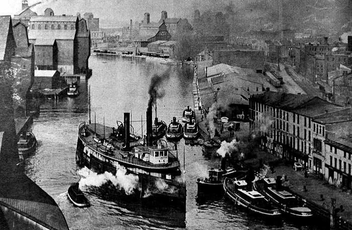 The foot of Main Street at around the 1890's. At right is the wharf between Main & Washington Streets, occupied by the Northern Steamship Company. The elevator at top left of the photo is the Brown Elevator. Travelers boarded steamships from the foot of Main Street from the 1830's through the 1950s.