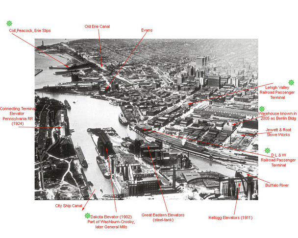 The 1920's were a static period for the inner harbor, in between two periods of change. By this time, the "old" Erie Canal visible above was no longer in use, having been supplanted in 1918 by the Barge Canal. The waterfront was nearly completely built up by the D. L. & W Railroad, which replaced the old mercantile Central and Long Wharf areas. The D. L. & W. had opened its new passenger terminal in 1917.