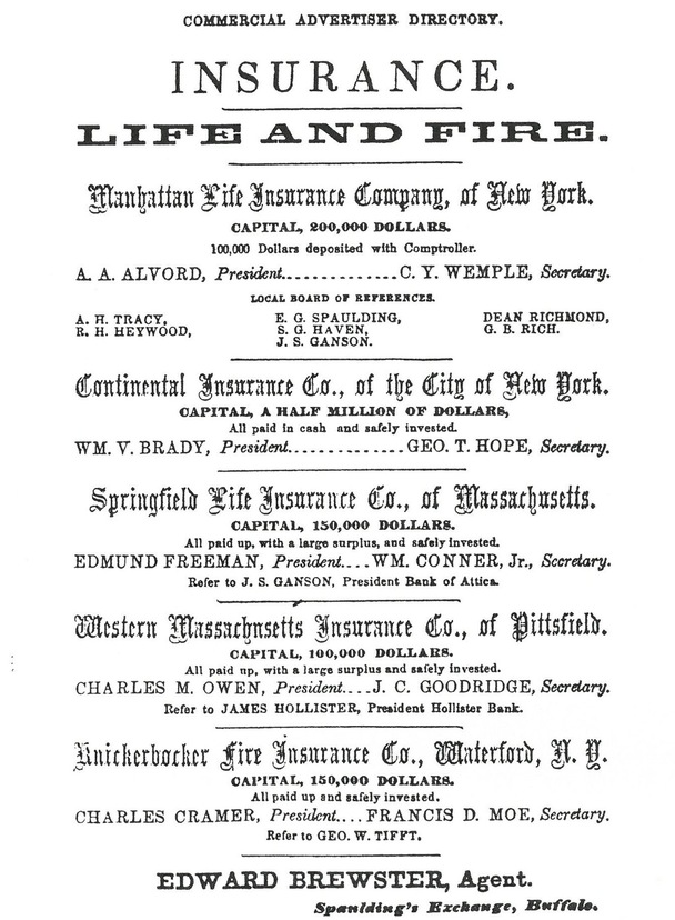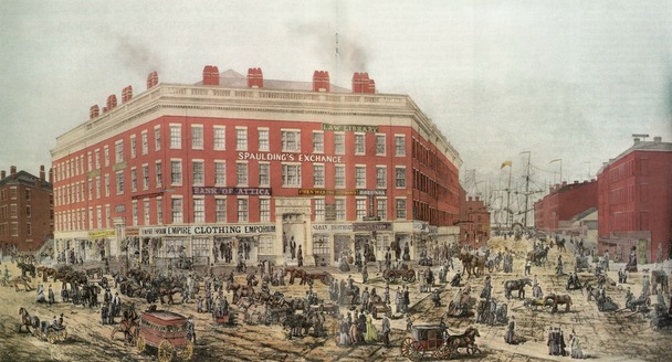 Following his retirement from Congress, Spaulding resumed a place of prominence in Buffalo’s financial and business life. In 1866 he founded the Farmers and Mechanics National Bank, and served for 40 years as its president. Also in the Exchange building was the Bank of Attica, presided over by Spaulding’s friend and relative by marriage, Gaius Barrett Rich. Spaulding was organizer and a principal of the Buffalo Gas Light Co., the Buffalo Street Railroad Co., the East Side Railroad and the International Bridge Co. which built the first railroad bridge to Canada in 1873 (still in everyday use in 2002). Spaulding arranged the necessary financing and capitalization for the bridge through New York banks. Earlier in his career (1845) Spaulding was instrumental in the development and building of Spaulding’s Exchange, a prominently positioned brick commercial complex housing offices, stores and banks. It was Buffalo’s “Main Place Mall” of the nineteenth century, located on Main Street and The Terrace, then the hub of the city’s business and commercial life. It was said to be the finest office building of its generation in the city, housing lawyers, bankers, insurance agents and real estate brokers. It was damaged and partially destroyed in an 1852 fire, but except for a few façade changes, including elimination of an elegant balustrade rail around the roof, was rebuilt substantially as before. Early Buffalo architect and builder John Harley Selkirk, whose Gas Works front exterior wall on West Genesee Street continues as a local architectural monument, was said to have been awarded the job of designed and supervising the 1852 reconstruction of Spaulding’s Exchange. An observer who once occupied living quarters in the “Exchange” commented on the building’s interior: “No tenant could ask for more imposing quarters. The wide central hall of the building is a balconied court. A wrought iron stairway circles up to the fourth floor. Wrought iron railings set off the balconies. The main hall is reached by two marble stairways.”