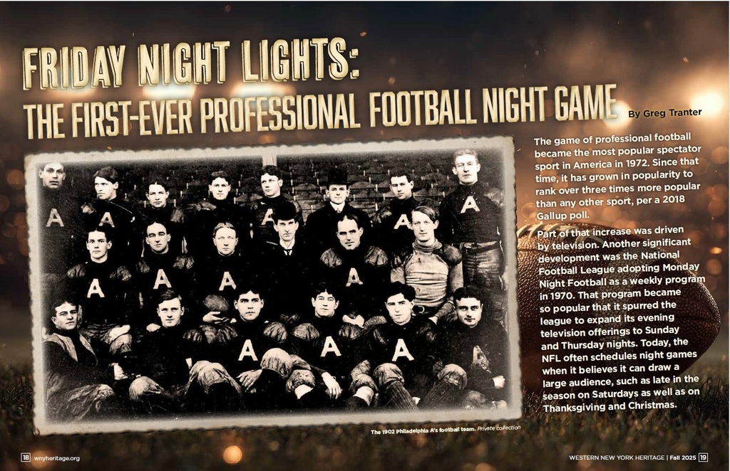 The story of the first professional football game played at night was featured in the Fall 2025 issue of Western New York Heritage.