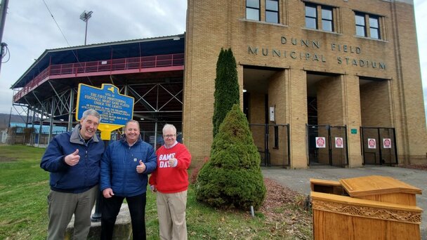 Author Greg Tranter, Elmira mayor Dan Mandell and Lee Elder, executive director of the Pro Football Researchers Association, pose in front of the new historical marker installed at Emira’s Dunn Field, November 21, 2025.