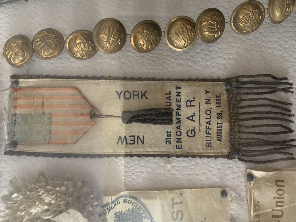 In 1862, Captain Bowen formed Bowen’s Independent Rifles, later becoming Company A, 151st Regiment NYSV. Upon close scrutiny, sure enough, there was a ribbon from the 1897 Buffalo Encampment in the collection. What a thrill to be able to view that ribbon and associate it with the information provided in Dennis Jewell’s article. Like putting a face to a name.