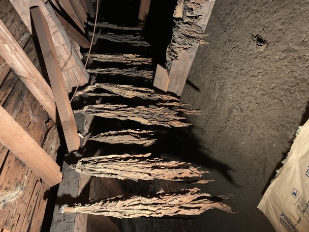 A week later, a broken window in our museum’s attic sent me on a mission to repair it. Not easily accessible, the president and I, with the aid of an extension ladder, were able to enter the attic through a small ceiling hatchway. We were met with a flurry of blown-in insulation and air that had not been disturbed in decades. Upon gaining access I was very surprised to see a row of tobacco leaves that had been hung to dry, with others laid out on one of the crossbeams nearby.