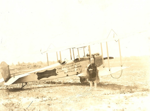 Readers of the Spring issue will recall that, as part of the publicity effort in advance of the 1920 production of the Passion Play, a pilot and plane was secured from the Curtiss Aircraft Company. Over a ten-day period, the Curtiss “Jenny” made about 16 flights across the region, from Silver Creek to Warsaw. In addition to the pilot, the airplane carried a “courier,” dressed as an ancient Roman, who would dramatically invite audiences to attend the upcoming performances.