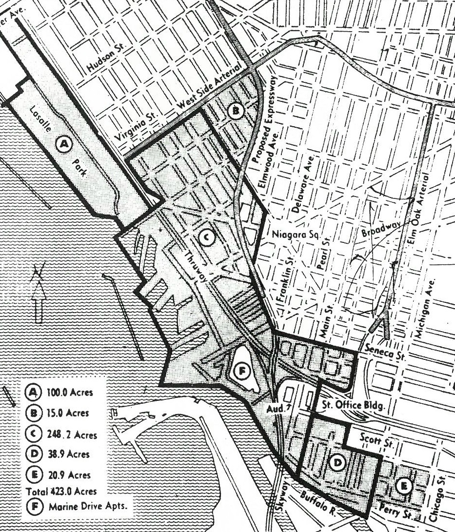 Map of the site proposed for a new downtown waterfront campus, 1966.