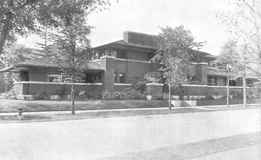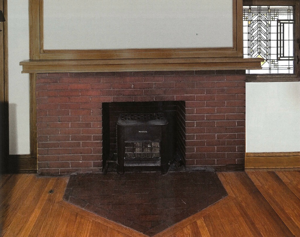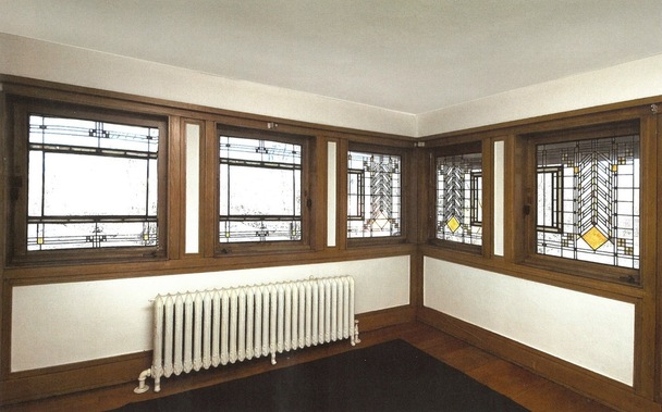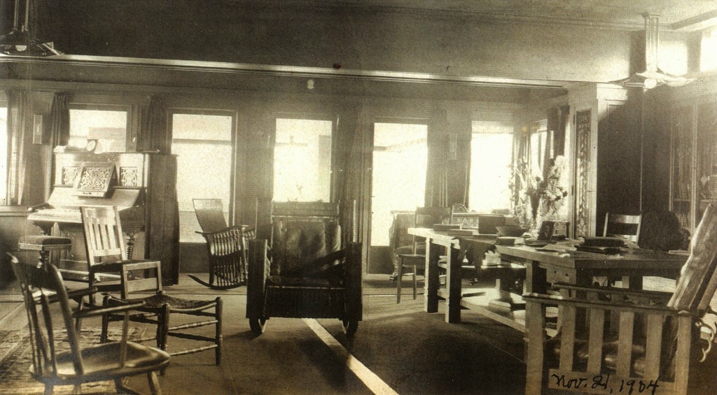 A photo dated November 1904 has recently been discovered. It shows the interior of the Living Room/Library looking towards the veranda. Among some miscellaneous non-Wrightian furniture, the massive Wright-designed library table is shown in good detail. Two of the elaborate drop-ceiling lights are shown in the corners.