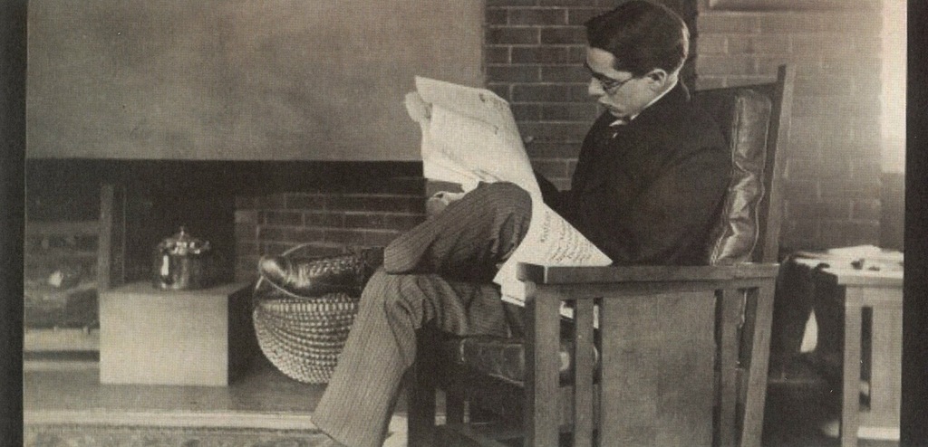 In this 1913 photo, Horton Hubbard Heath, son of W.R. Heath, is sitting in a Wright-designed chair at the living room fireplace. The photo is from Horton Heath’s personal photo album.