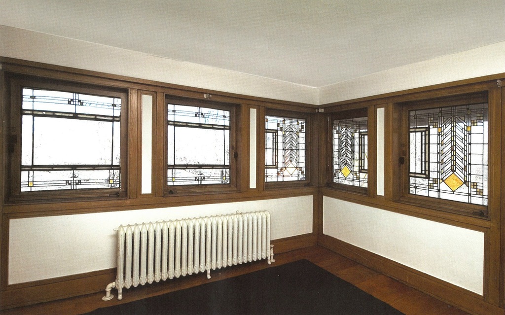 A continuous horizontal array of five original art-glass windows remains in an upstairs rear bedroom of the Heath House.
