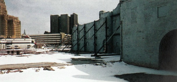 Buffalo Gas Works façade, West Genesee Street, with City Hall in background.