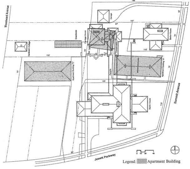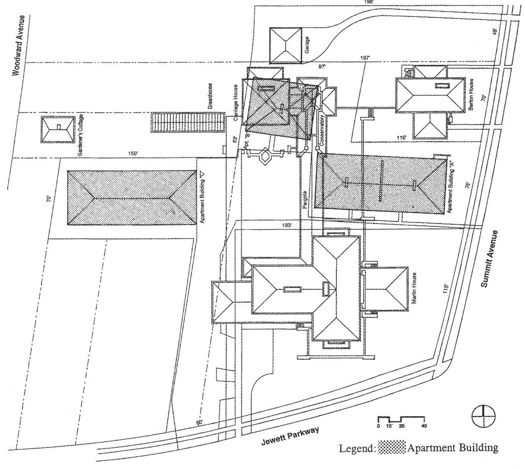 Location of the Martin House, Barton House and Parkway Apartments, showing where the carriage house, conservatory and pergola are to be reconstructed.