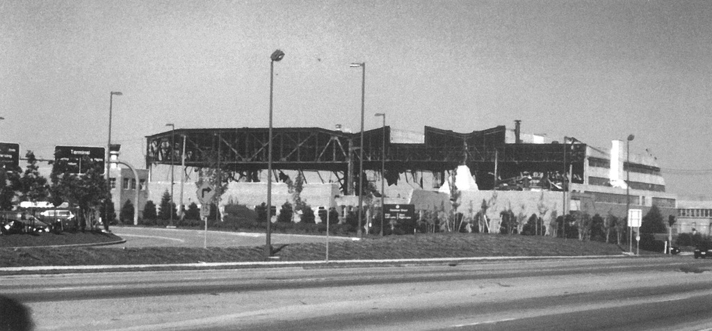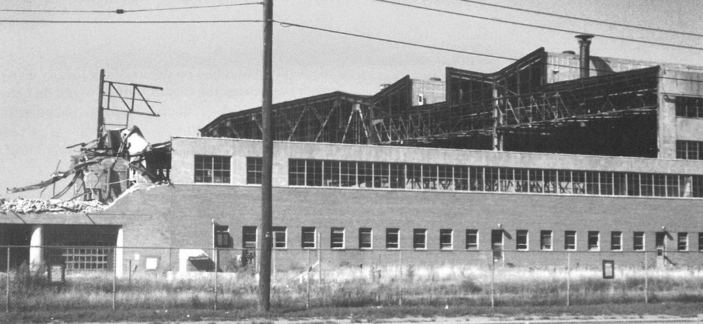Westinghouse Plant demolition (from the southwest) showing the structural steel framing of the Albert Kahn building with the moderne style administration building at the right.