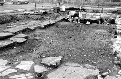 Maiden Lane paving removed for deeper site examination. This excavation was halted and the parking lot repaved.