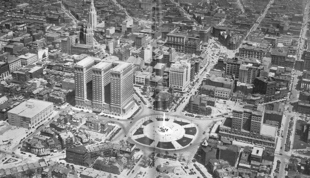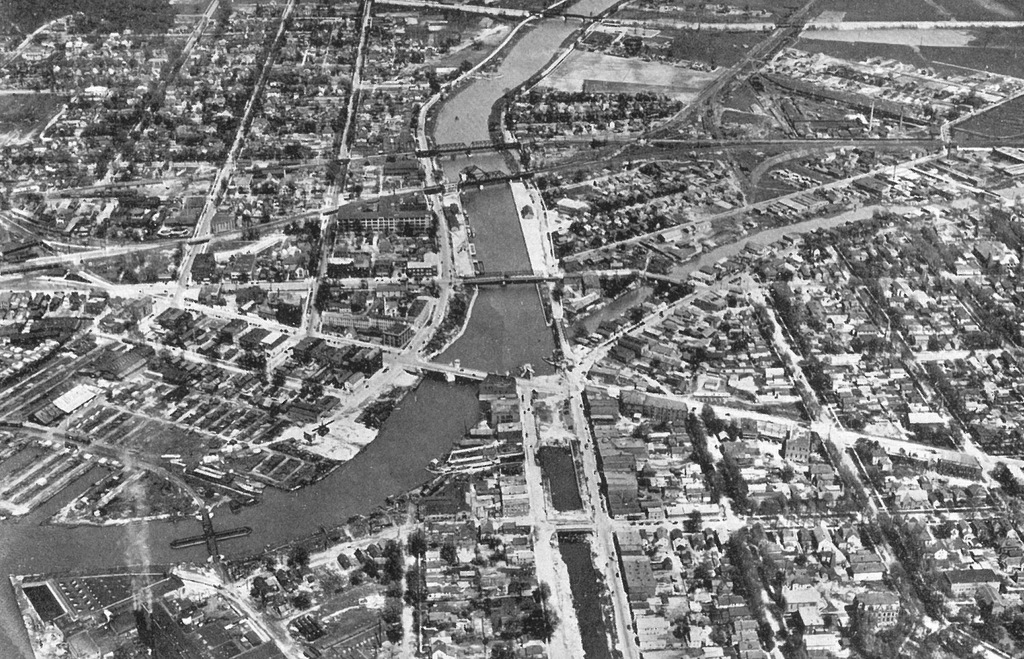 The Buffalo waterfront at the foot of Main Street. The buildings of the canal district, lower Main Street and the “Cobblestone District” are still in place. The Dakota Elevator stands near the end of the City Ship Canal. The south Michigan Street lift bridge is visible in the foreground.
