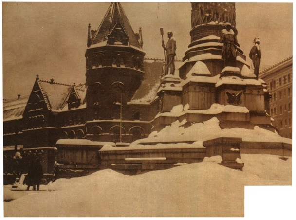 The Soliders and Sailors Monument at Lafayette Square. The Lafayette branch of the Public Library background.