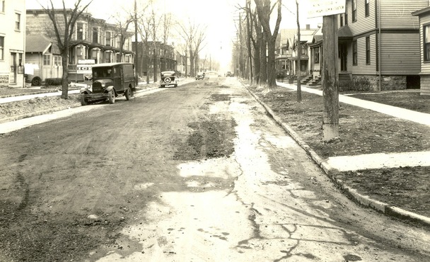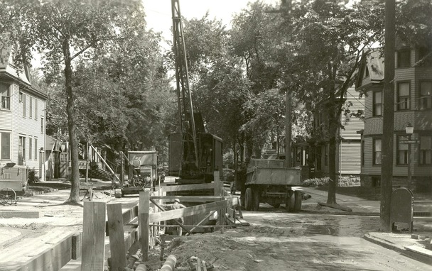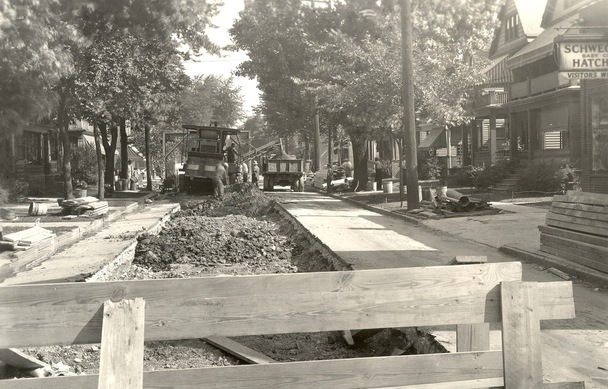 A southerly look down Masten Avenue from the intersection with Glenwood, June 22, 1936, showing the trencher at work. Of interest are the various feeder pipes which lie in the center of the road and along both curbs.