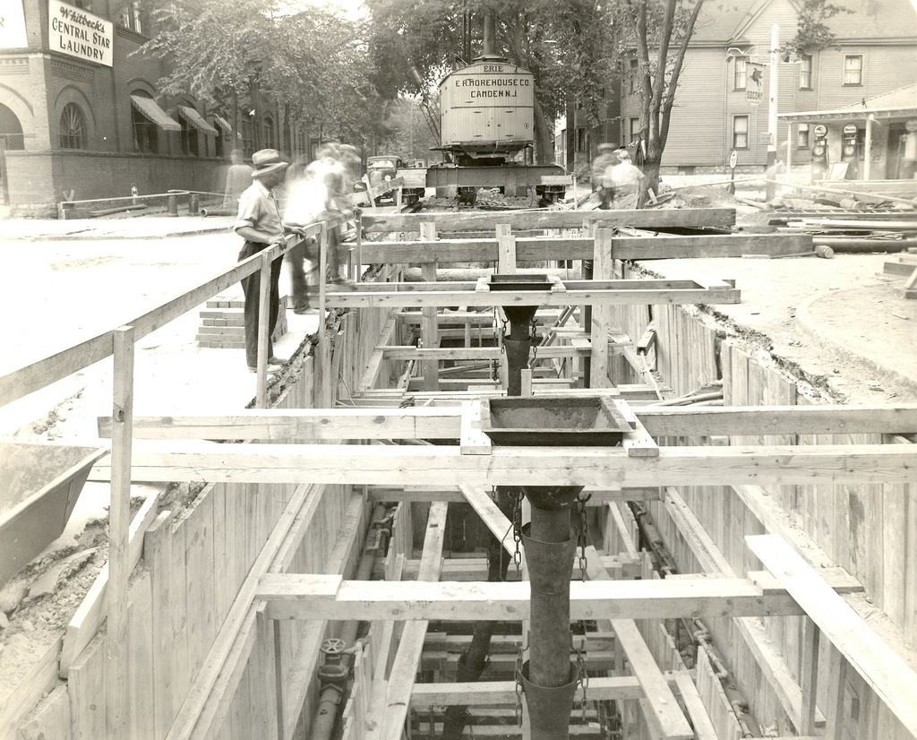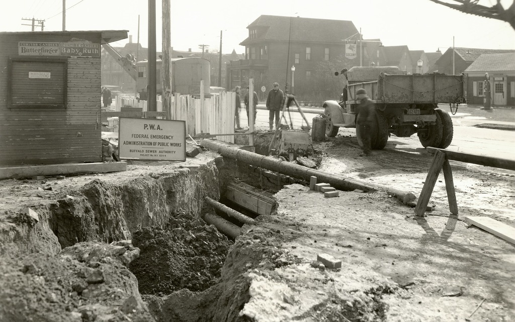 Large amounts of New Deal money were not spent in Buffalo until about 1935, but between that year and 1937 over $45 million had been spent, employing over 75,000 people. By far the largest single expenditure in the PWA relief money allocated to Buffalo was for the construction of a new sewer. The photo collection of the Western New York Heritage Press contains a large number of photographs, documenting this 15-million-dollar project. One may argue that there is nothing aesthetically pleasing about pictures of sewer work. In their efforts to document the project, however, the photographers also captured images of city streets lined with beautiful elms before Dutch Elm disease wiped them out. Also appearing are countless other details; vintage automobiles, machinery and advertisements, shops long since closed and candid moments of Buffalo citizens going about their daily lives.