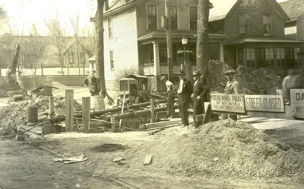 Sewer construction at the corner of Abbott Road and Boone Street, February 17, 1937. The photo is taken in a southerly direction. Note again the prominent PWA sign, as well as the Baby Ruth candy advertisement on the building at left.