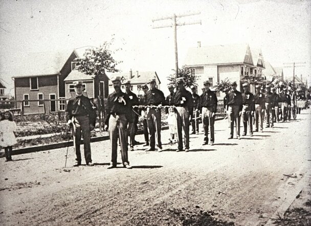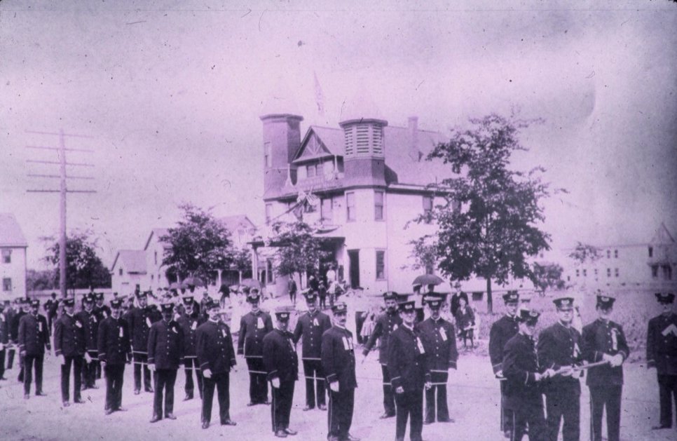 Kenmore volunteers on Tremaine Avenue preparing for a parade, ca. 1905. Note the steam-powered, hand-drawn fire wagons at the rear. Most streets were still unpaved.