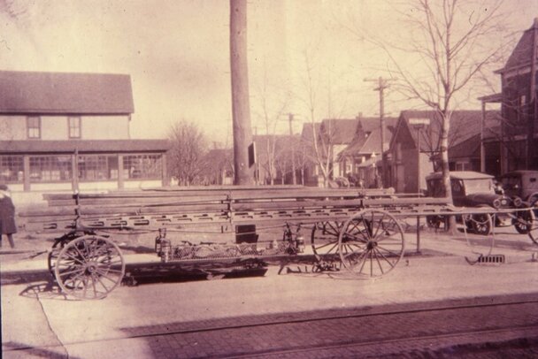 This 1919 photo shows the hand-pulled hook and ladder that was used in Kenmore’s early history. In 1922 it was attached to a Model T chassis and served another five years. In the background is the former Winfield Mang store and tavern, which was moved to Warren Avenue when the Eberhardt mansions were constructed in 1893.