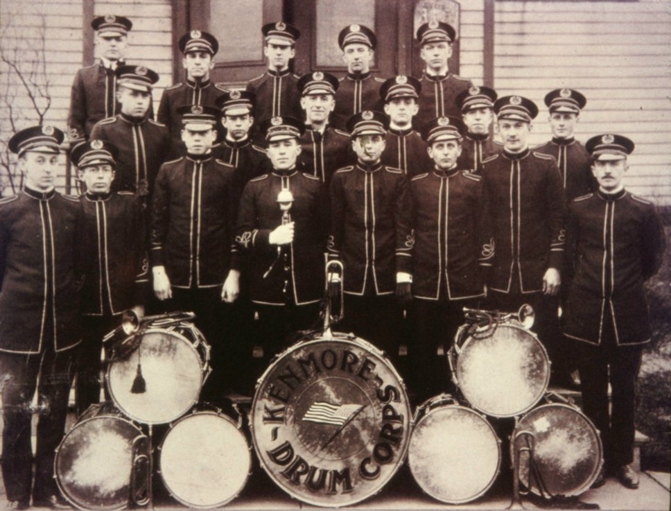 Kenmore’s Alert Host Company was formed in 1903. Here they are shown in front of the Village and Fire Hall, ready for a parade. The right-hand tower was raised in 1904 and housed a fire bell. Previously the Kenmore Methodist-Episcopal Church bell served as a fire alarm.