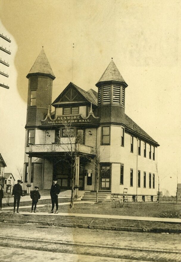 Kenmore Village and Fire Hall, erected in 1903. Hand-drawn fire equipment for hose companies, chemical engine and hook and ladder were housed here. Previously the equipment was stored in local farmers’ barns. The left tower was used to dry hoses, the right tower would have a fire bell.