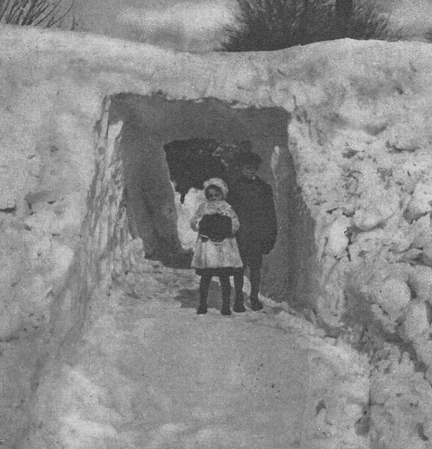 Two youngsters built this “snow bridge” in Niagara County, near Pekin, ca. 1923.