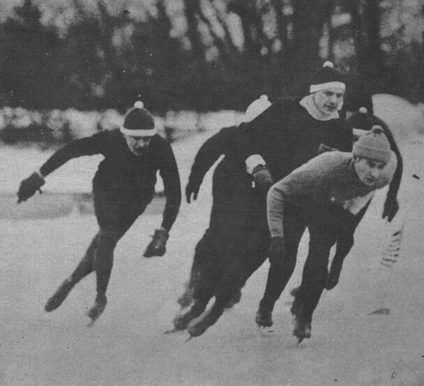 Skaters round a corner during one of the races held during Cazenovia Park’s skating carnival, ca. 1923.