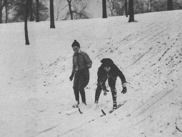 Ruth and Paul Minthorne try their hands—or rather their feet—at skiing on a slope in Delaware Park.
