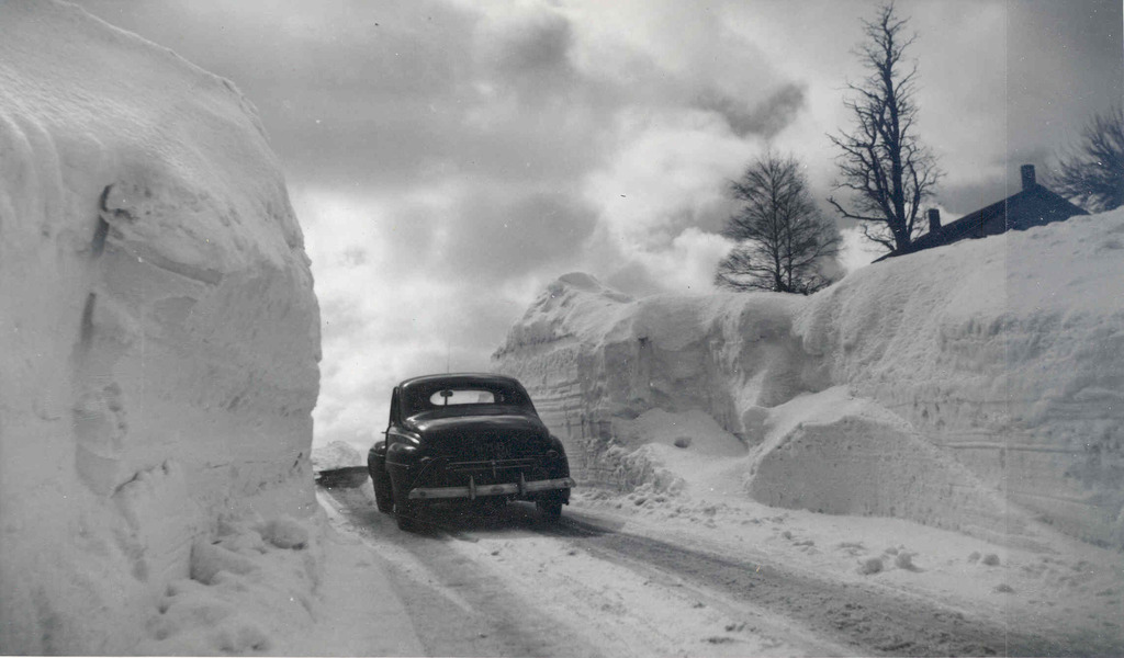 A driver cautiously negotiates a “snow cut” along a Chautauqua County road during the winter of 1958.