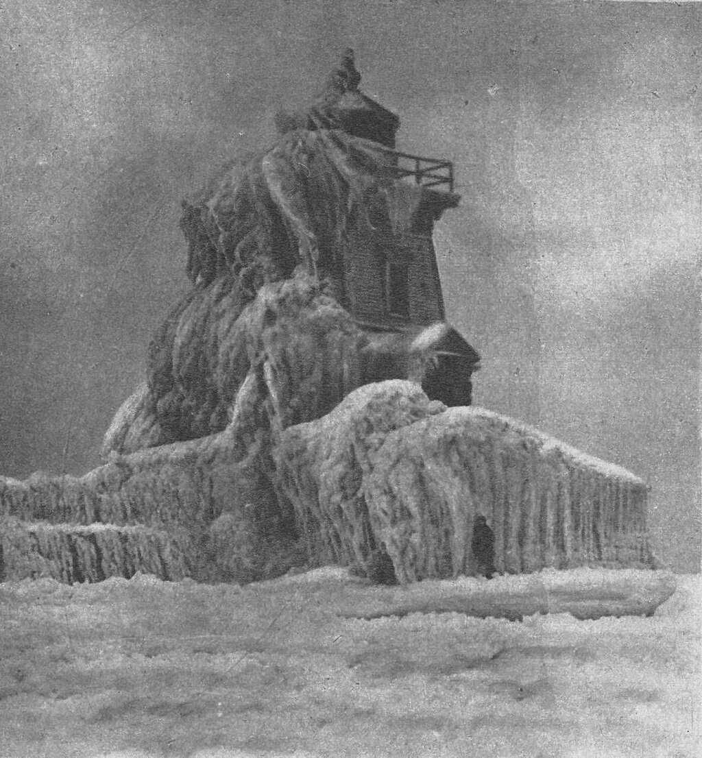 The frozen beacon lighthouse at Dunkirk provides a vivid sense of life along the Great Lakes, ca. 1924