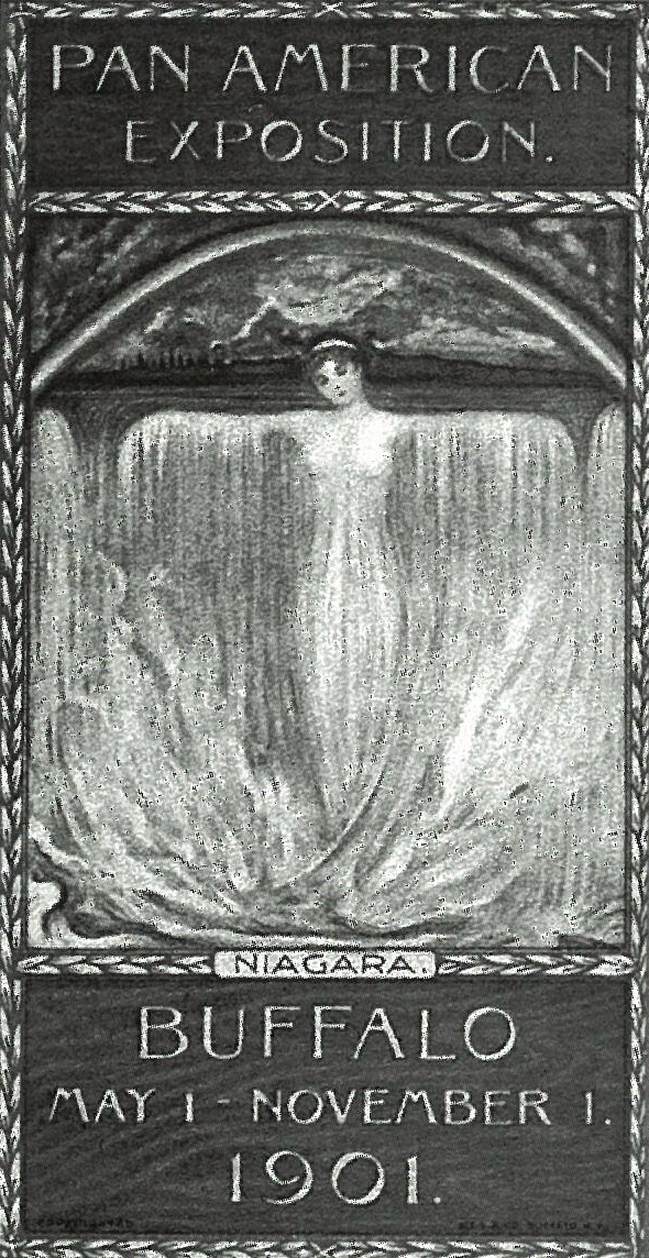 Of all of the images and icons to survive, perhaps the most endearing is Evelyn Rumsey Cary’s “Spirit of Niagara.” Mrs. Cary, a society woman and artist, was on the Women’s Board of Managers of the Pan-Am and in charge of the Fine Arts Committee. She created the official Pan-Am poster as both an emblem and an advertisement. The New York World, called it “the sweetest picture poem of the great waterfall that has ever been produced.” It was sent all over the world. By Feb 5th 1901 over 1,000,000 posters in ten colors and gold had been distributed and a second printing of 500,000 had been ordered. Schools, municipalities, art galleries and individuals received copies in the months before the Pan-Am, and everyone instantly fell in love with the image. Everyone, that is, except for the Superintendent of Schools in Providence, Rhode Island.