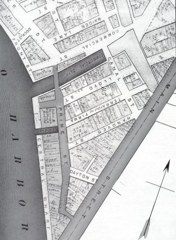 1872 MAP: Showing building lots and owners of the 1,000-foot-long Central Wharf between the foot of Main Street and the Commercial Slip.