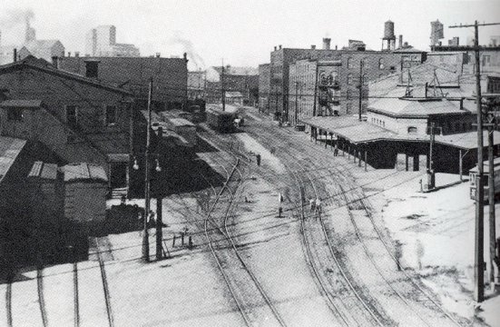 RAILROAD TRACKS: A 1909 photograph of tracks and sidings in Prime Street and on the site of the demolished Hazard Block.