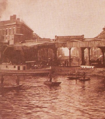 COMMERCIAL SLIP: A Bliss 1870s photo of the Commercial Slip end of the Central Wharf, probably taken from the Watson Elevator observation deck. An arch-trussed "propeller" steamboat is at the Wharf. Rafted canal barges stand off the Townsend & Coit building marked "Sail Loft."