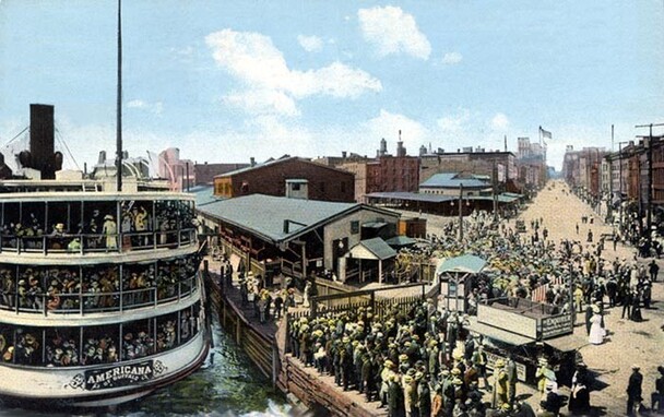The foot of Main Street, 1946. The passenger ship Greater Detroit is docked (center) at the Central Wharf; the ship South American is docked at the D. L. & W. terminal at right. The Canadiana is visible near its berth at the terminus of the Commerical slip, upper left.