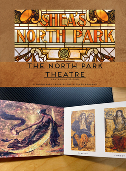 This book is an 7"x5" 18-page book created by photographer/artist Christopher Behrend. Anyone who's seen a movie at the North Park Theatre has gazed in awe at its unique interior - stained glass facade, marble lobby, classic ticket booth, recessed dome, gorgeous murals, and more. This photography book shows the end result of the restoration of the Art Nouveau murals painted by Raphel Beck, brought back to life by Swiatek Studios, that includes past relics from the projection room and more.